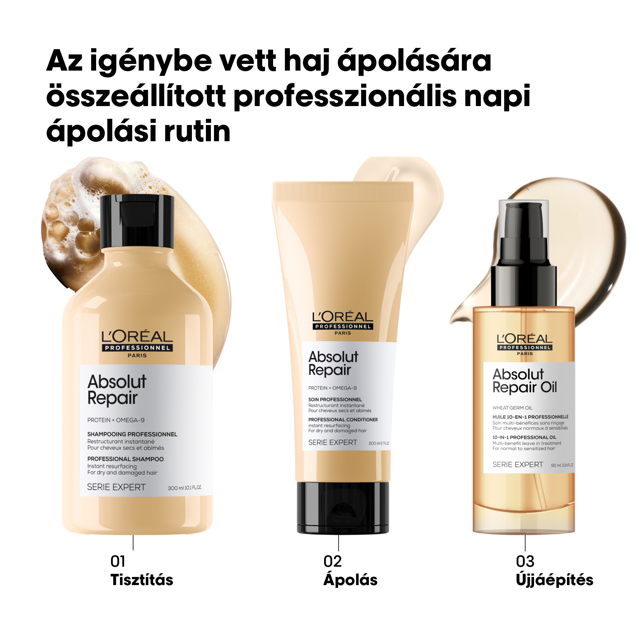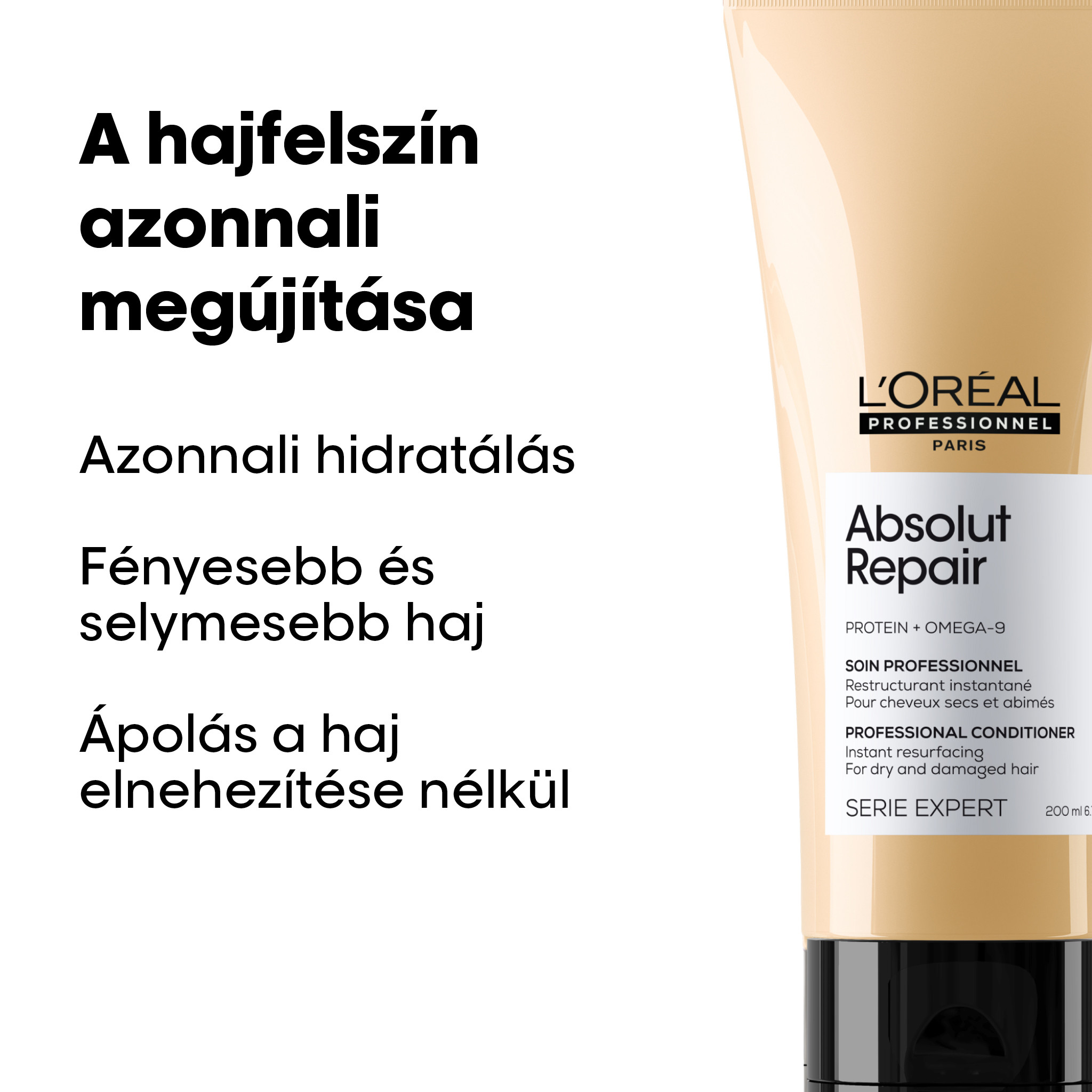 Az Absolut Repair balzsam professzionális regenerálást biztosít az igénybe vett és száraz hajnak. A regeneráló balzsam megújítja az igénybe vett haj felszínét, selymes tapintást biztosít a számára, ápolja a hajrostokat és megkönnyíti a haj kifésülését, anélkül, hogy elnehezítené a hajszálakat. Az Absolut Repair regeneráló sampon használatát is magába foglaló ápolási rutin alkalmazását követően a haj könnyebben kezelhetővé és ragyogóbbá válik. A rendkívül hatékony quinoa és protein tartalomnak köszönhetően a hajrostok megerősödnek és megújulnak. Ezt a professzionális terméket fodrászok ezrei használják szerte a világon a L’Oréal Professionnel Paris szalonokban. Az optimális eredmények elérése érdekében alkalmazza az Absolut Repair hajápolási rutin mind a három lépését: a tisztító és tápláló sampont, a regeneráló balzsamot és a hajban maradó, többfunkciós 10-IN-1 hajápoló olajat.FIGYELMEZTETÉS: Amennyiben a termék a szembe jut, azonnal öblítse ki bő vízzel.
