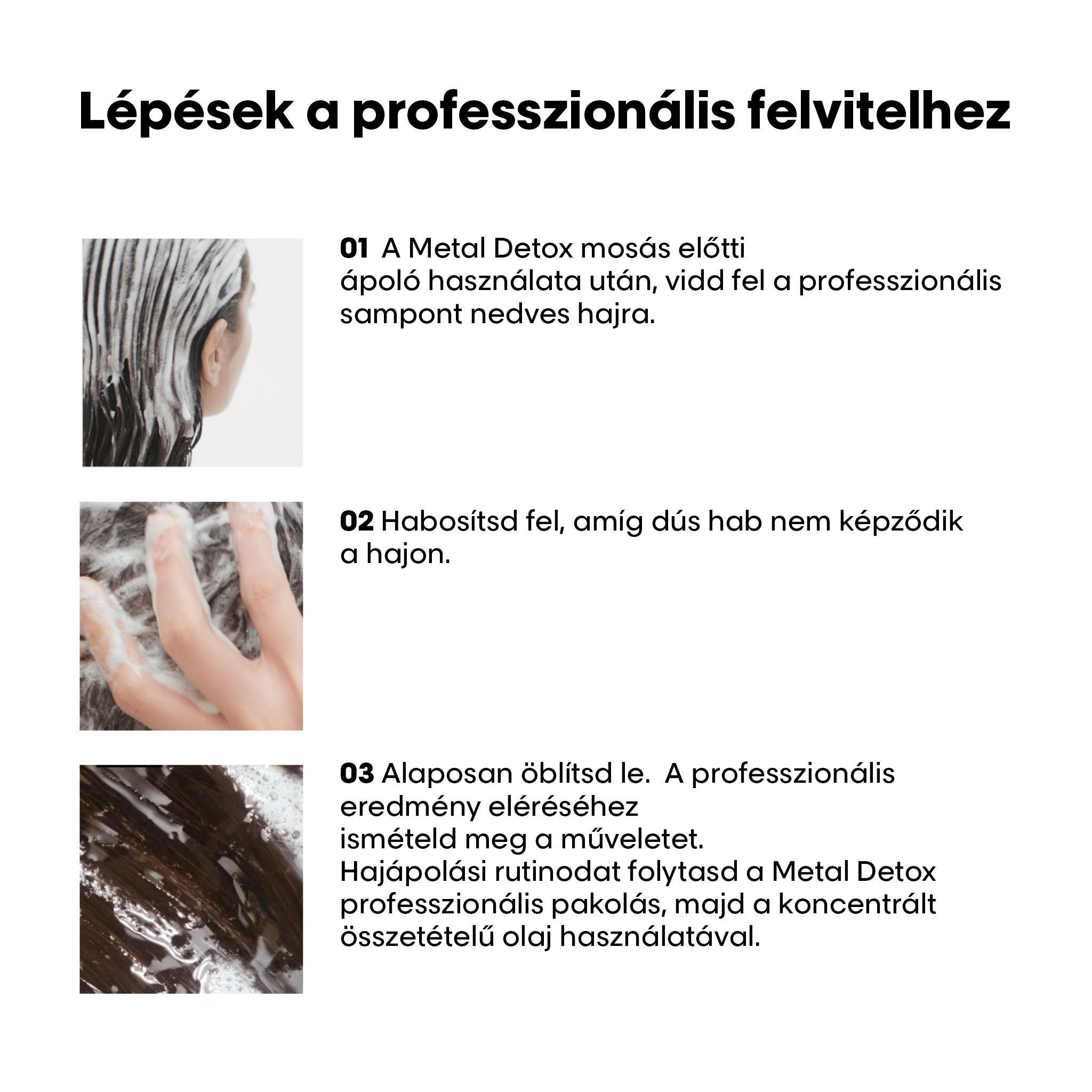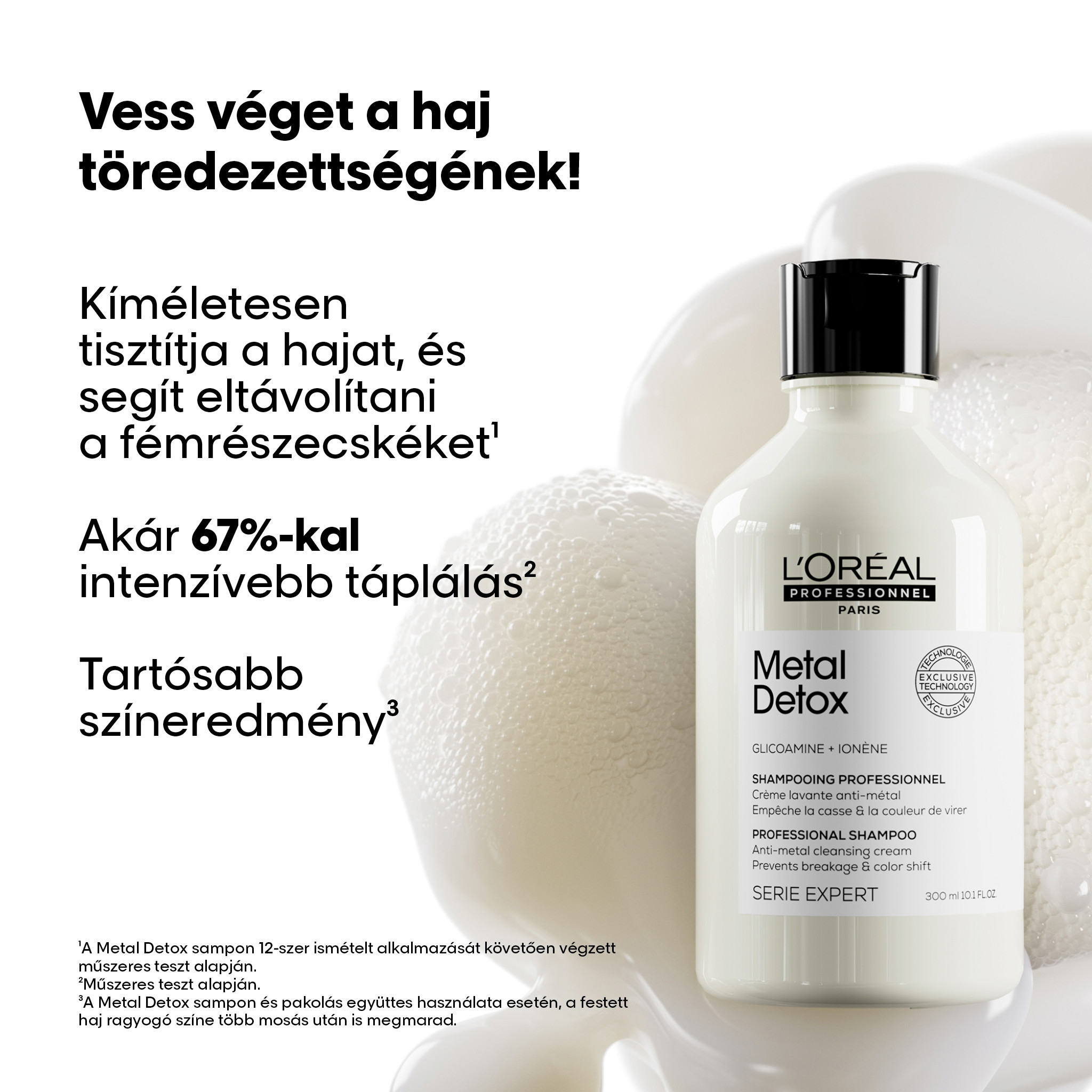 Bármilyen textúrájú, festett, igénybe vett, világosított és natúr hajra is felvihető. ?A Metal Detox sampon 12-szer ismételt alkalmazását követően végzett műszeres teszt alapján. ?Műszeres teszt alapján. ?A Metal Detox sampon és pakolás együttes használatát követően végzett műszeres tesztek alapján. ?A Metal Detox sampon és pakolás együttes használata esetén a festett haj ragyogó színe több mosás után is megmarad. 5Nem tartalmaz állati eredetű összetevőket vagy melléktermékeket.FIGYELMEZTETÉS: Amennyiben a termék a szembe jut, azonnal öblítse ki bő vízzel.