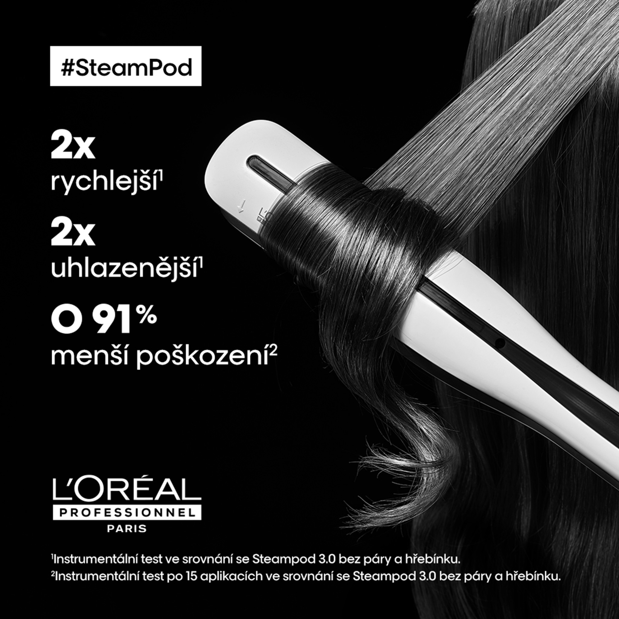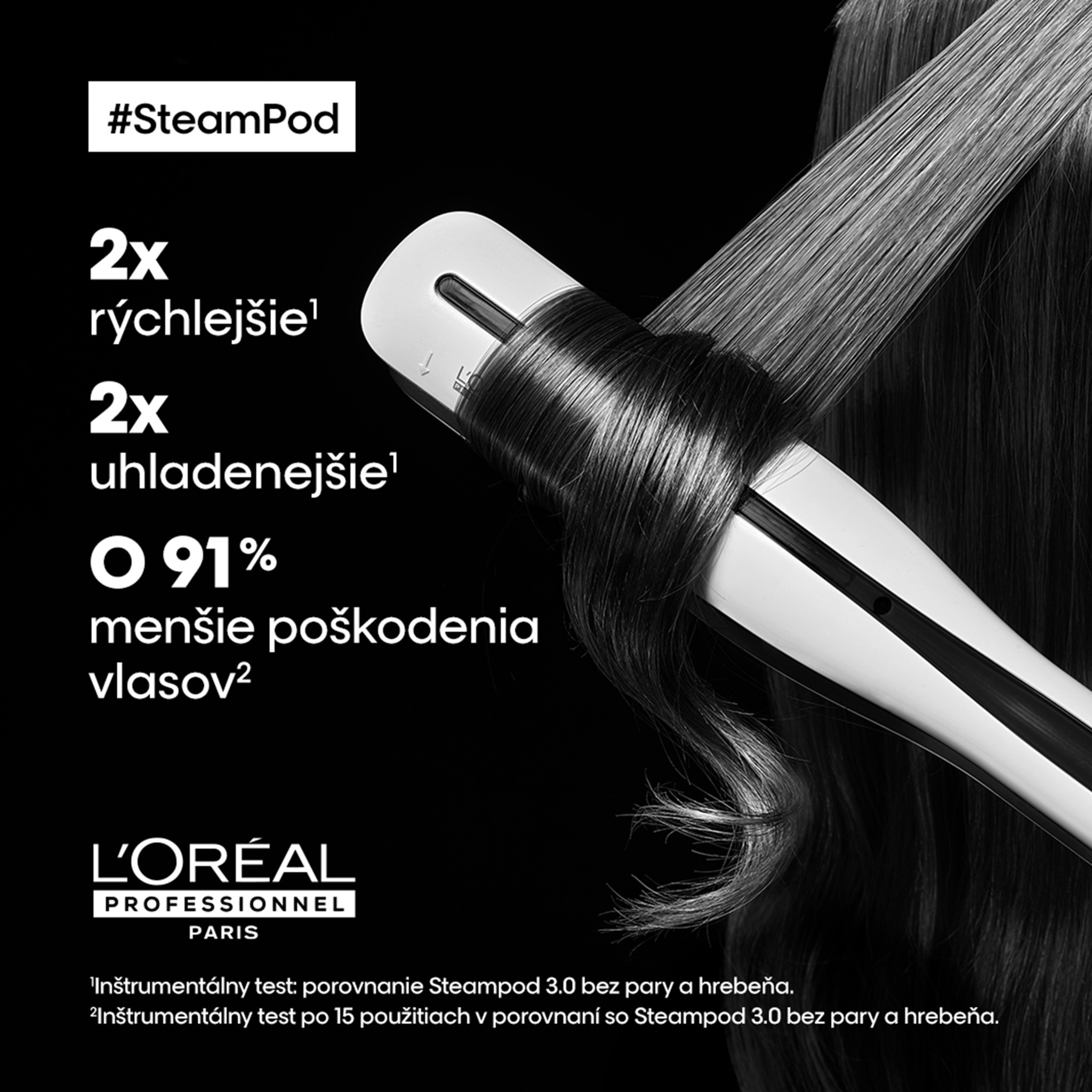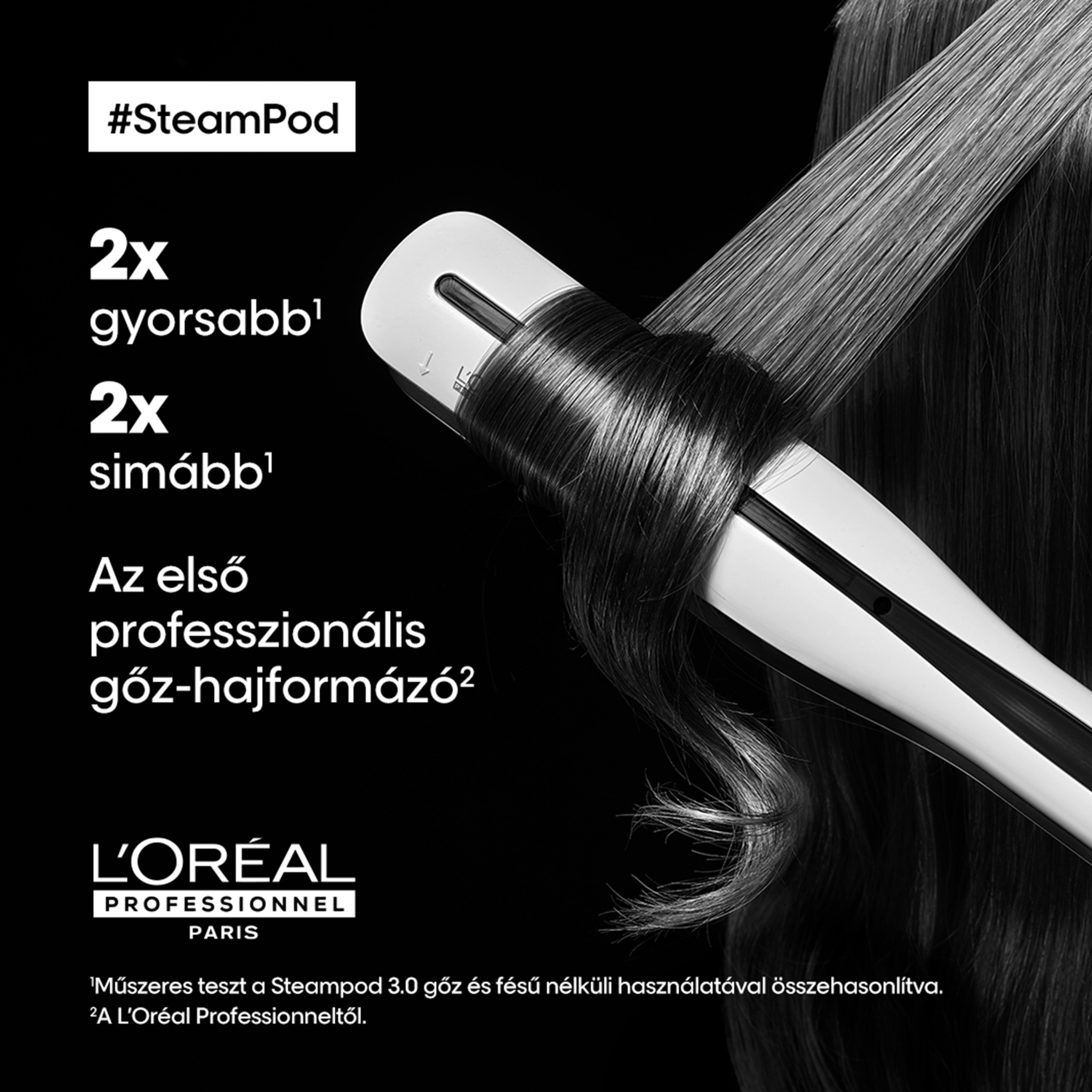 A SteamPod 3 a L'Oréal Professionnel szabadalmaztatott gőztechnológiával működő professzionális hajformázója, amelynek használatával bármilyen típusú haj könnyedén kiegyenesíthető vagy hullámosítható. A haj azonnal átalakul: Alkosson tökéletesen sima, bársonyos hatású, természetes tapintású frizurákat vagy varázsoljon laza hullámokat a hajába.Akár 2x gyorsabb hajegyenesítés?, akár 2x simább haj?, akár 91%-kal kevesebb töredezés?. A SteamPod 3 hajformázó bemutatja szabadalmaztatott gőztechnológiáját: folyamatos gőzáramlás (0,8 g/perc) a láthatóan simább hajért.1?A SteamPod 3 használatát követően végzett műszeres teszt alapján, gőz és fésű nélkül alkalmazott SteamPod 3 használatával összehasonlítva. 2Világosított hajon, a SteamPod 3-mal 15-ször ismételt átfésülést követően mért töredezettség mértéke, gőz és fésű nélkül alkalmazott SteamPod 3 használatával összehasonlítva.