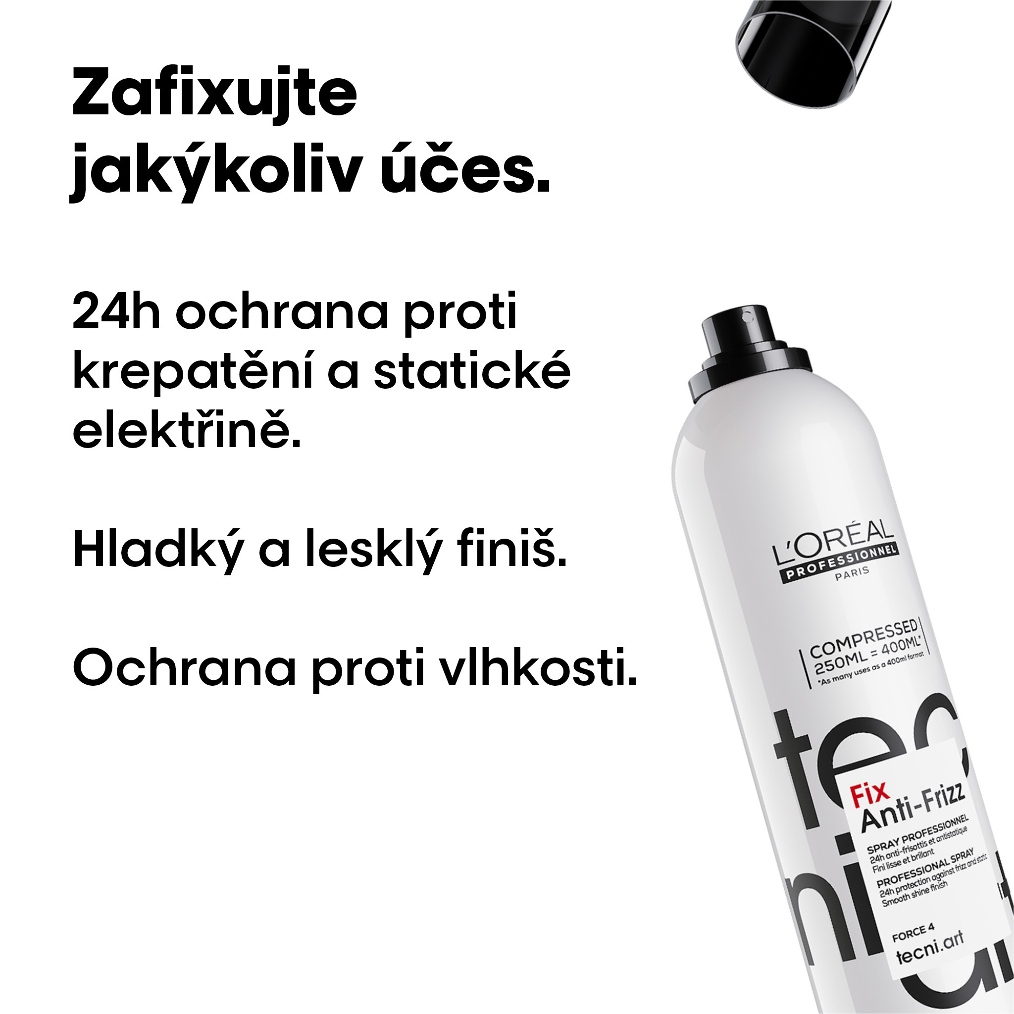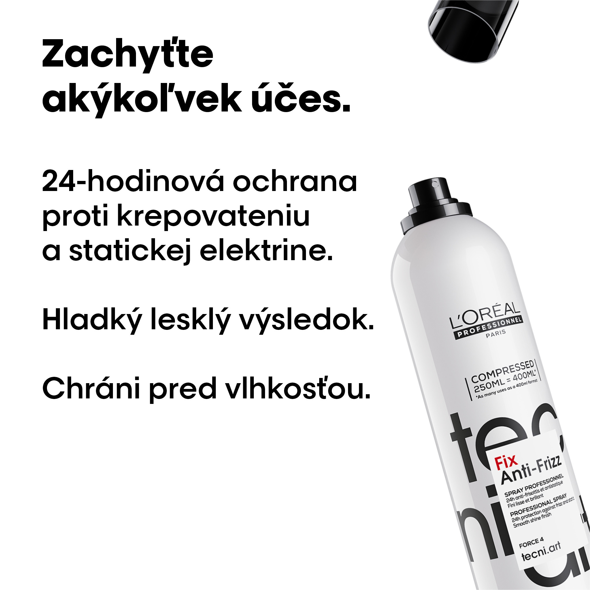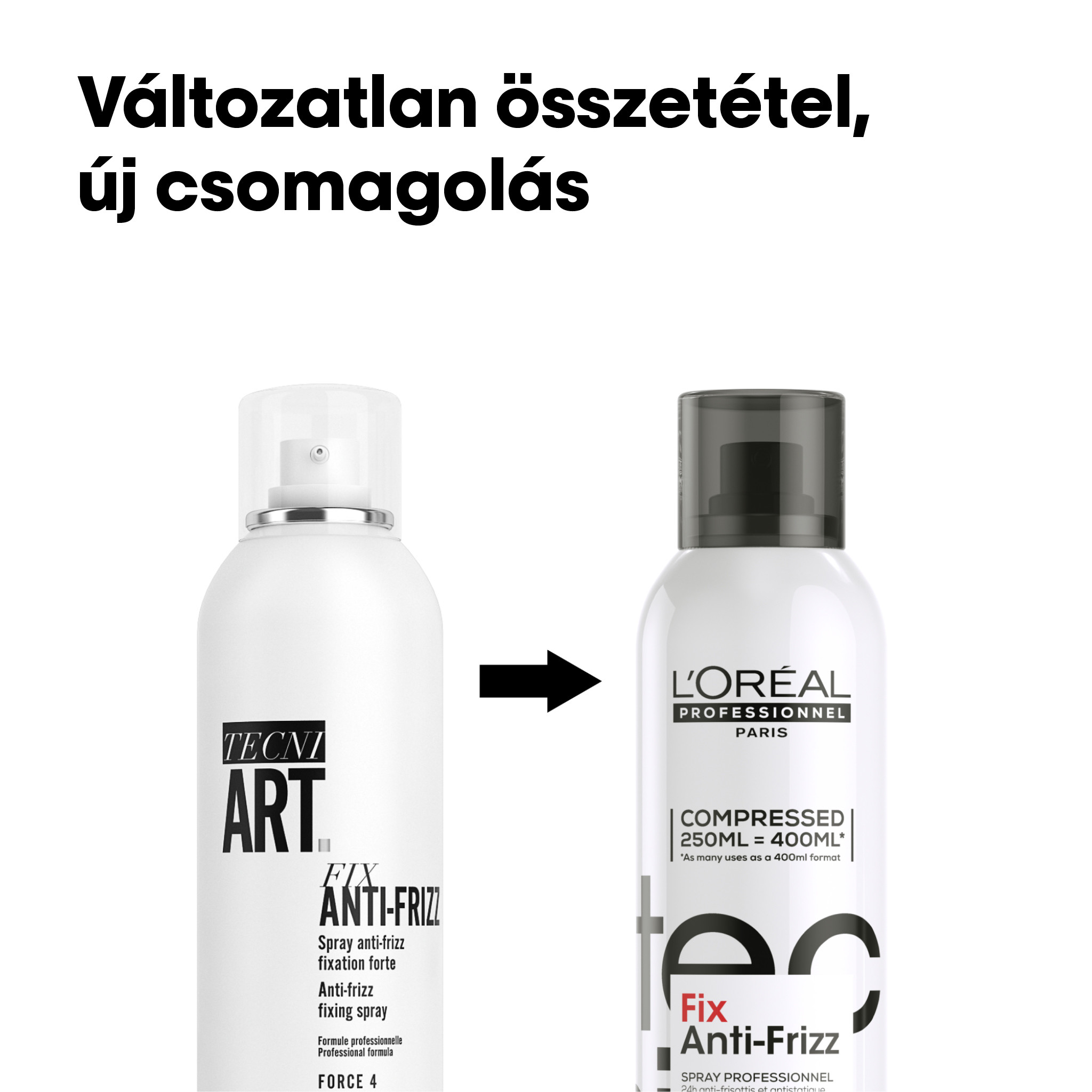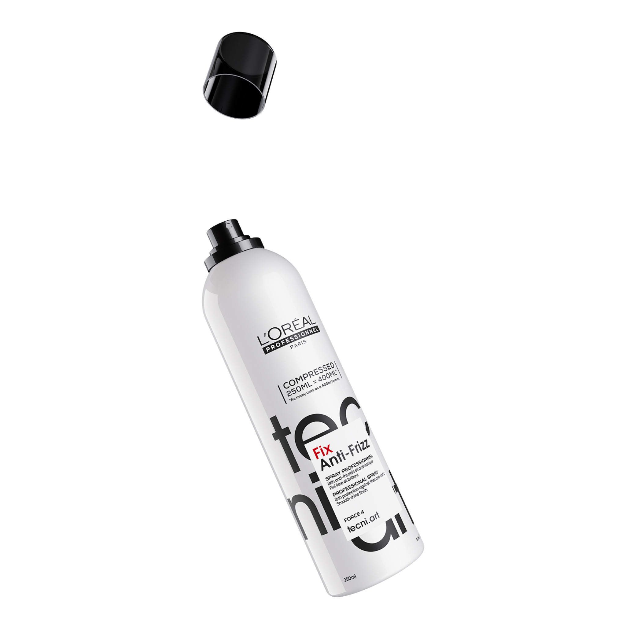 A L’Oréal Professionnel Tecni.Art Fix Anti-Frizz spray egy párataszító, szöszösödésgátló hajlakk, amely akár 24 órán át antisztatikus hatást biztosít. A termék segítségével páratlan védelmet adhat a frizura formájának. A Fix Anti-Frizz az Ön számára is nélkülözhetetlen termék, ha szeretné megszelídíteni rakoncátlan, szálló hajszálait vagy megakadályozni a haj nem kívánt szöszösödését. FRIZURA: A pára hatásának ellenálló, hosszan tartó frizurát eredményez, amelynek erős tartást és tündöklő fényt biztosít.