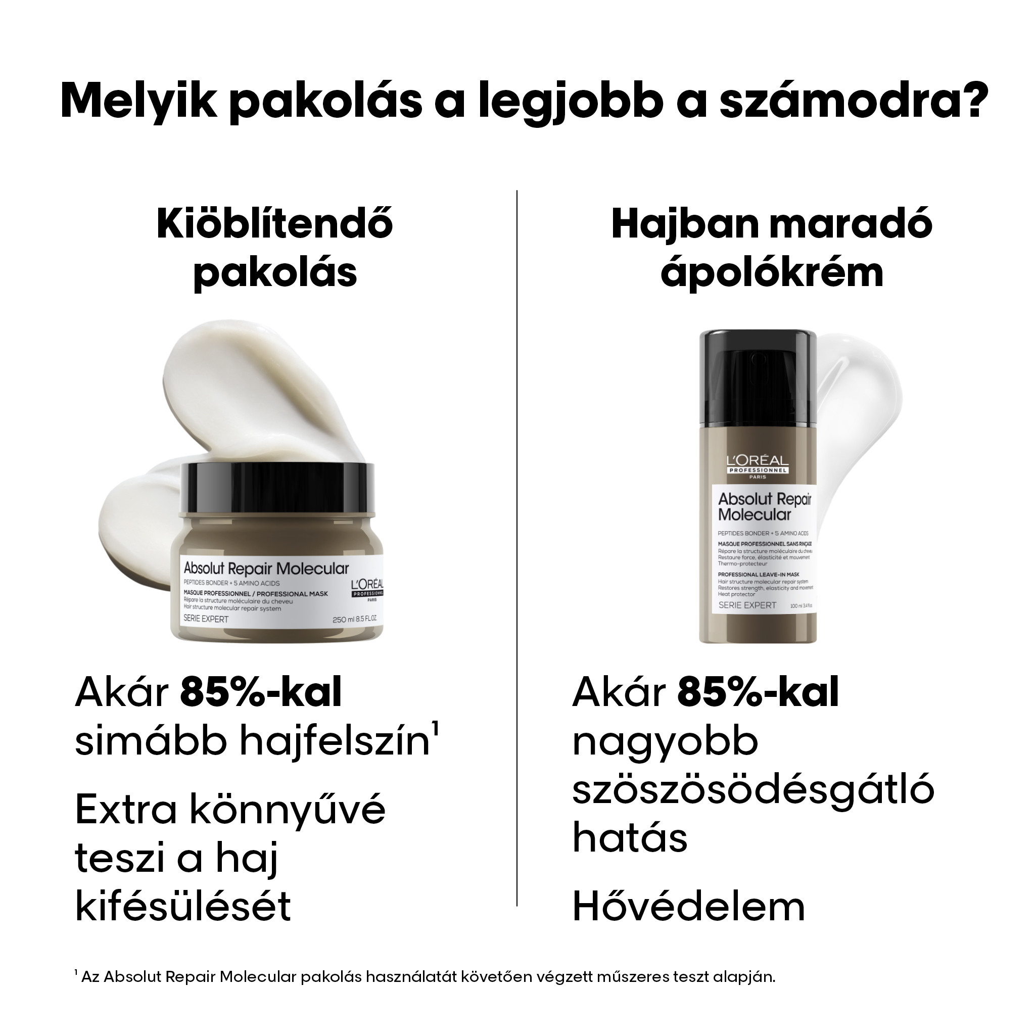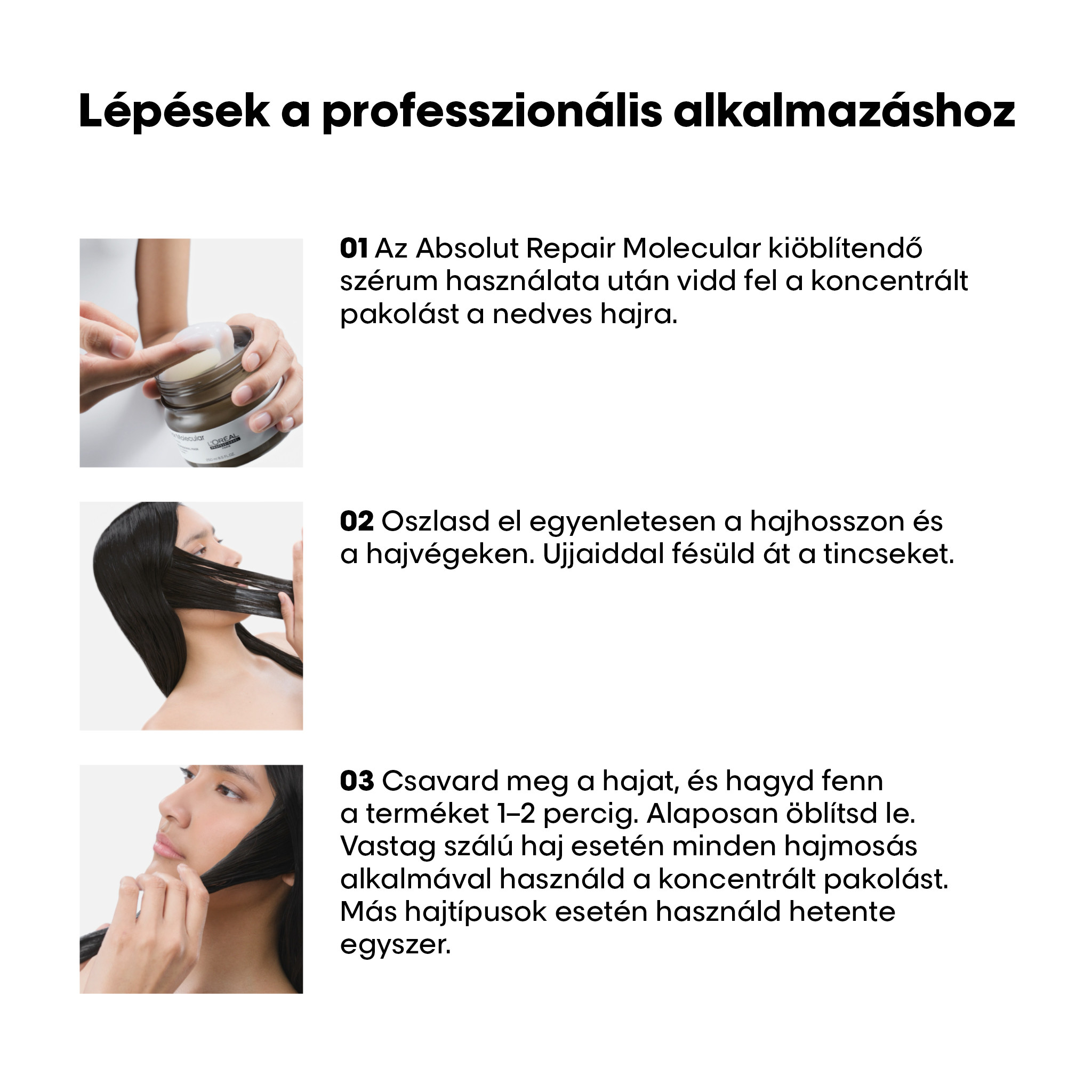 Bármilyen típusú igénybe vett hajra, így festett, világosított és natúr hajra is ajánlott a használata. 1Az Absolut Repair Molecular hajban maradó pakolás használatát követően, a hajrost makromolekuláris szerkezetét vizsgáló műszeres teszt alapján. 2Aminosavak és peptides hajkötésvédő. 3Az Absolut Repair Molecular sampon, kiöblítendő szérum és pakolás 7 alkalommal megismételt együttes használatát követően végzett műszeres teszt alapján. 4Makromolekuláris szintű hidratálással – az Absolut Repair Molecular pakolás használatát követően végzett műszeres teszt alapján. 5Az Absolut Repair Molecular pakolás használatát követően végzett műszeres teszt alapján. 6Az Absolut Repair Molecular sampon, kiöblítendő szérum és pakolás együttes használatát követően végzett fogyasztói teszt alapján. 7Az Absolut Repair Molecular pakolás első használatát követően végzett műszeres teszt alapján.FIGYELMEZTETÉS: Amennyiben a termék a szembe jut, azonnal öblítse ki bő vízzel.