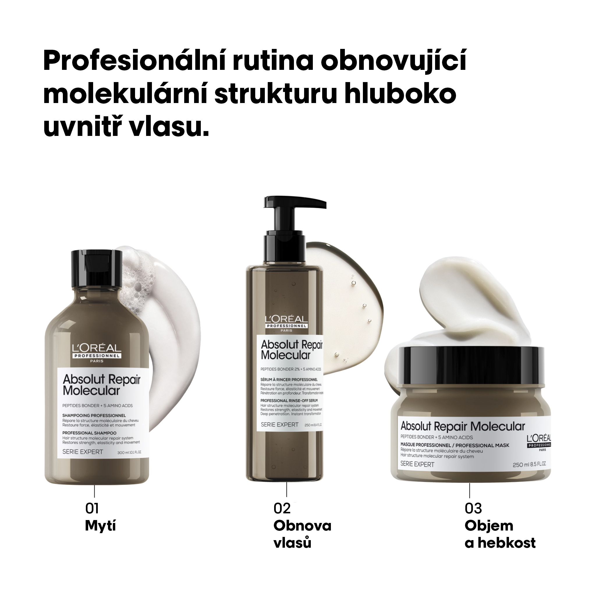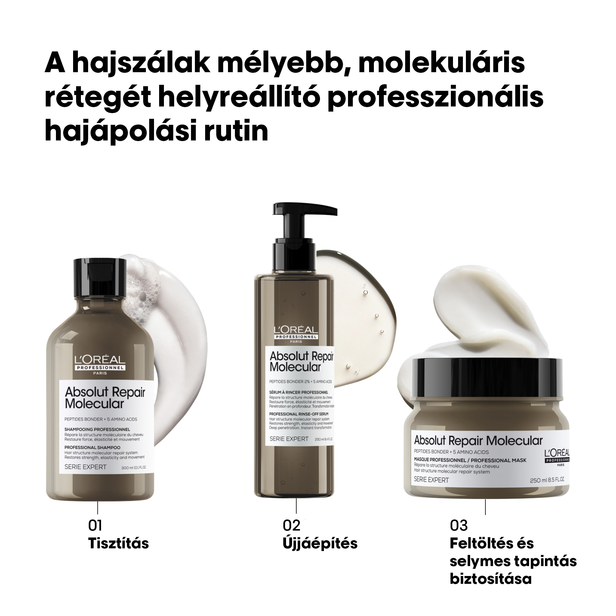 A haj igénybevétele esetén a hajszál peptidekből felépülő molekuláris szerkezete meggyengül. A peptidmolekulák többsége viszont túl nagy méretű ahhoz, hogy egyszerűen vissza lehessen juttatni őket a hajrostba, így a károsodás szinte visszafordíthatatlan. Tudományos felfedezés – Absolut Repair Molecular Akár már egyszeri használattal is segít helyreállítani a 2 évnyi károsodást1. A L’Oréal Advanced Research kutatóintézetnek elsőként sikerült alkotórészeire bontania a peptideket, és külön-külön bejuttatnia azok alkotóelemeit a hajrostba2. A haj belsejébe jutó alkotórészek ezután visszaalakulnak peptidekké, és segítenek újjáépíteni a haj molekuláris szerkezetét3.
