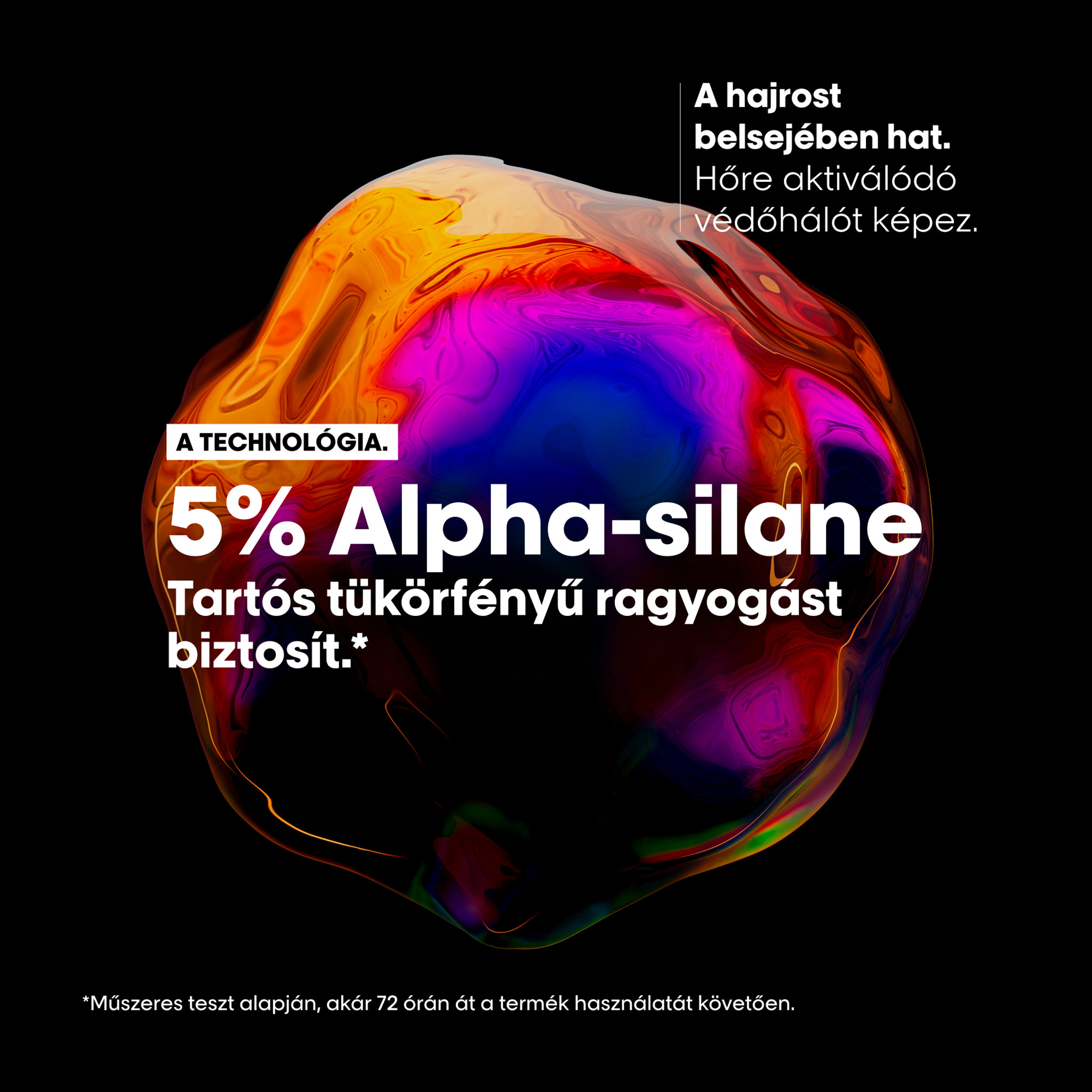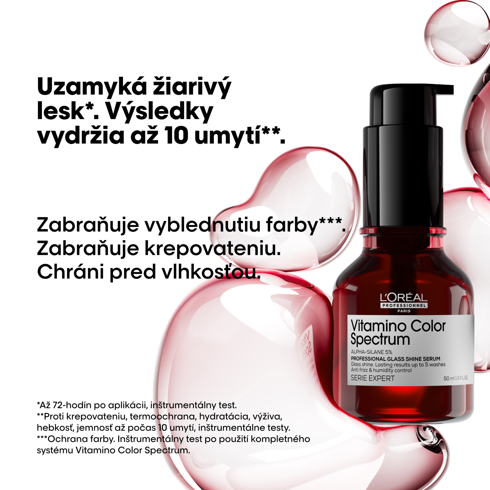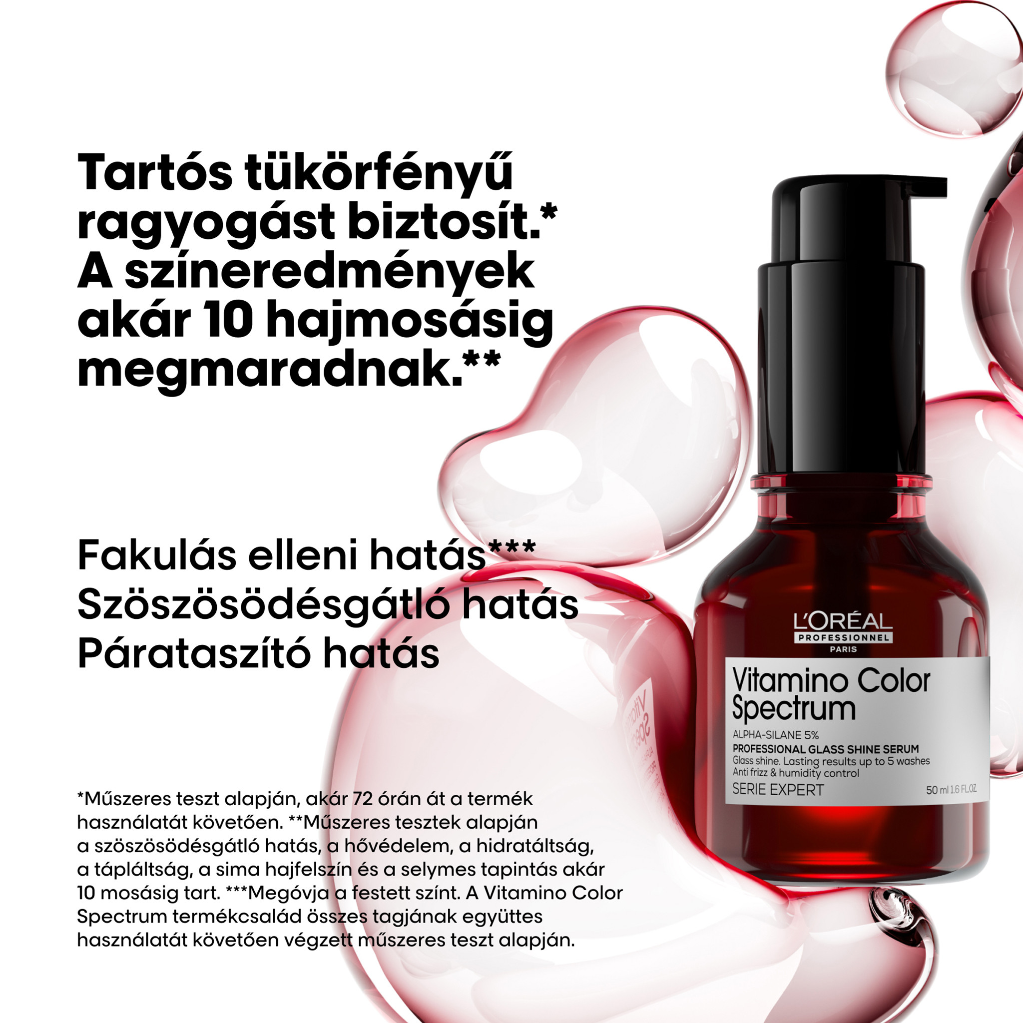 5% Alpha-silane hatóanyaggal gazdagított, tükörfényű ragyogást biztosító professzionális Vitamino Color Spectrum fényszérum a L’Oréal Professionneltől. Márkánk szabadalmaztatott hajban maradó széruma azonnal tükörfényű ragyogást és akár 10 mosásig megmaradó eredményeket biztosít**. A víz hozzáadása nélkül előállított Alpha-silane egy olyan ápoló hatóanyag, amely hőre aktivált védőpajzsot képez a hajrost felszínén. Eredmények:– Védelmet nyújt a festett hajnak az UV-sugárzás káros hatásaival szemben.– Párataszító hatás.– Védelmet nyújt a párával szemben (akár 80%-os páratartalom esetén is).– Hővédelmet nyújt akár 230 °C-ig.***A haj azonnal hidratáltabbá válik, a hajfelszín lesimul, a hajszálak pedig selymesebb tapintást kapnak, amely akár 10 mosásig is megmaradhat a hajban.****Őrizze meg a frissen festett szín szépségét a színspektrum mind az 5 dimenziójában a teljes Vitamino Color Spectrum hajápolási rutin alkalmazásával.***** Élénk színek akár 100 napon át******A szöszösödésgátló hatás, a hővédelem, a hidratáltság, a tápláltság, a sima hajfelszín és a selymes tapintás akár 10 mosásig tart, a tükörfényű ragyogást biztosító fényszérum alkalmazását és 10 normál hajmosást követően végzett műszeres teszt alapján.**Megóvja a színt. Műszeres vizsgálat a teljes Vitamino Color Spectrum rendszerrel 4 hetes használat után.***A Vitamino Color Spectrum Glass Shine Szérum használatát követően végzett műszeres teszt alapján. ****A tükörfényű ragyogást biztosító fényszérum alkalmazását és 10 normál hajmosást követően végzett műszeres teszt alapján.*****A Vitamino Color Spectrum termékcsalád összes tagjának történő együttes használatát követően végzett műszeres teszt alapján.
