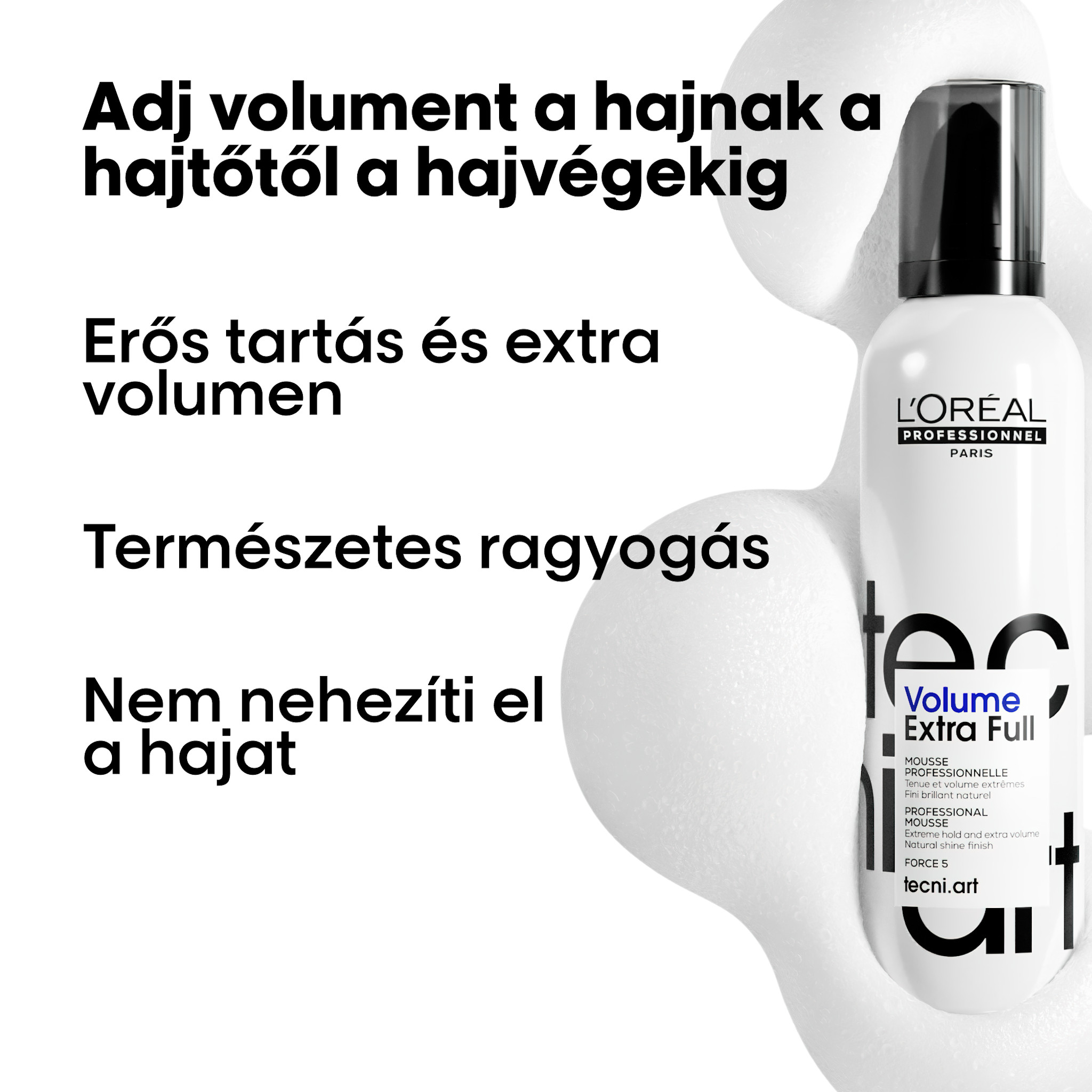 A L’Oréal Professionnel Tecni.Art Volume Extra Full segítségével extra volumennű frizurák készíthetők. A termék erős tartást biztosít, anélkül, hogy elnehezítené a hajat. FRIZURA: XL-méretű beszárított frizurák, lenyűgöző volumenű haj, dús hatású lófarkak és hajfonatok.